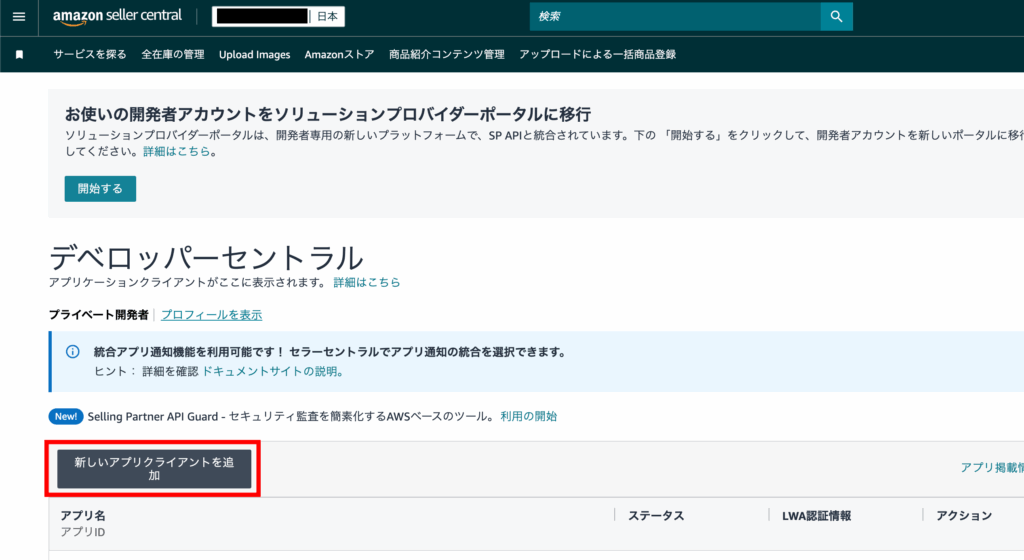 - セラーセントラルのサイドバーの「アプリとサービス」→「アプリの開発」